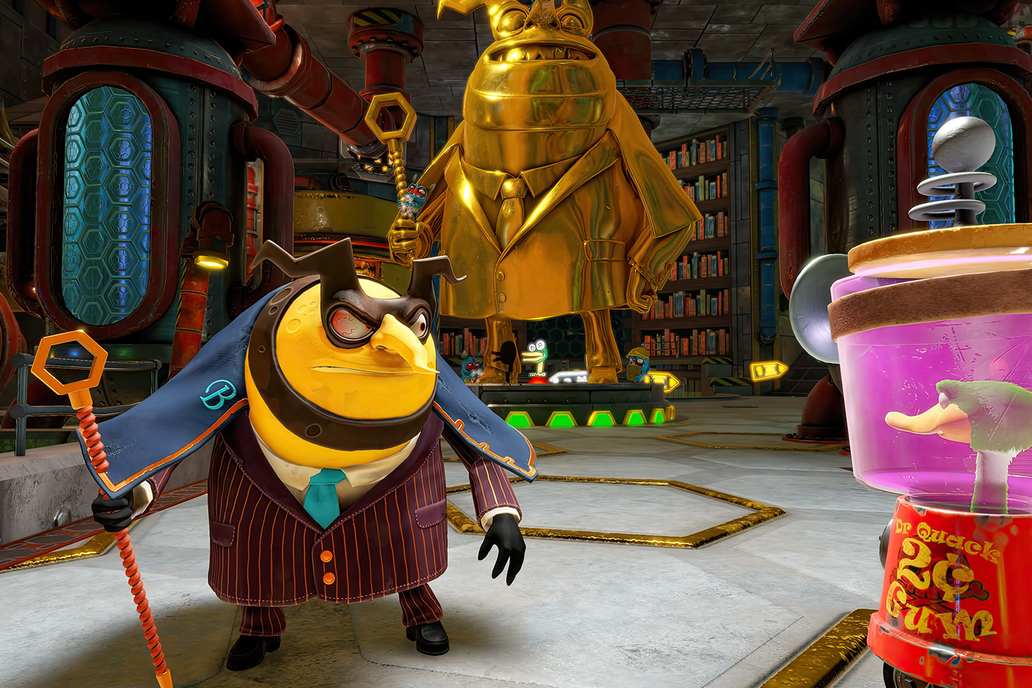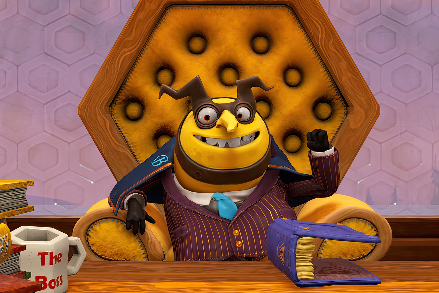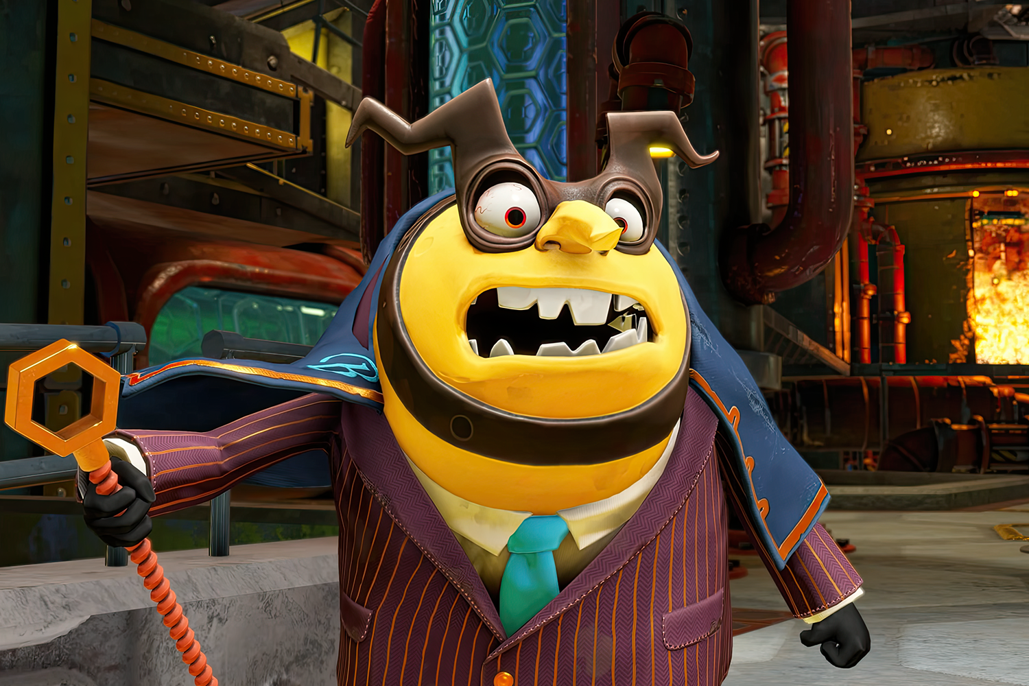 When players battle Capital B, the fight begins with him hurling beehives that release swarms of angry bees. Players can evade these attacks either by using Yooka’s Reptile Roll to escape or by defeating the bees with Laylee’s Sonar Splosion ability. If players avoid taking damage, Capital B becomes frustrated and throws a tantrum, creating an opportunity to deal damage using the Air Attack or Tail Twirl ability. After sustaining enough damage, Capital B calls Dr. Quack requesting reinforcements in the form of Corplets. Due to Dr. Quack’s incompetence, he accidentally sends two Frostberry bushes along with blue Corplets, giving Yooka and Laylee an advantage. Capital B then flies around continuing to throw beehives which players must dodge by using the Flappy Flight ability. This pattern repeats until Capital B announces it is time to move to the next level. At this point the roof opens to reveal green lime acid and Capital B begins slamming himself onto the ground, creating powerful shock waves until his cane becomes stuck. This gives players another opportunity to damage him. Following this, he sends out even more angry bees which can be avoided by performing Laylee’s Sonar Shield. During the final phase Capital B flies to the center and fires stingers. To defeat him players have to dodge them and ensure they hit Capital B instead. After taking enough hits he falls to the ground, marking the end of the final battle.